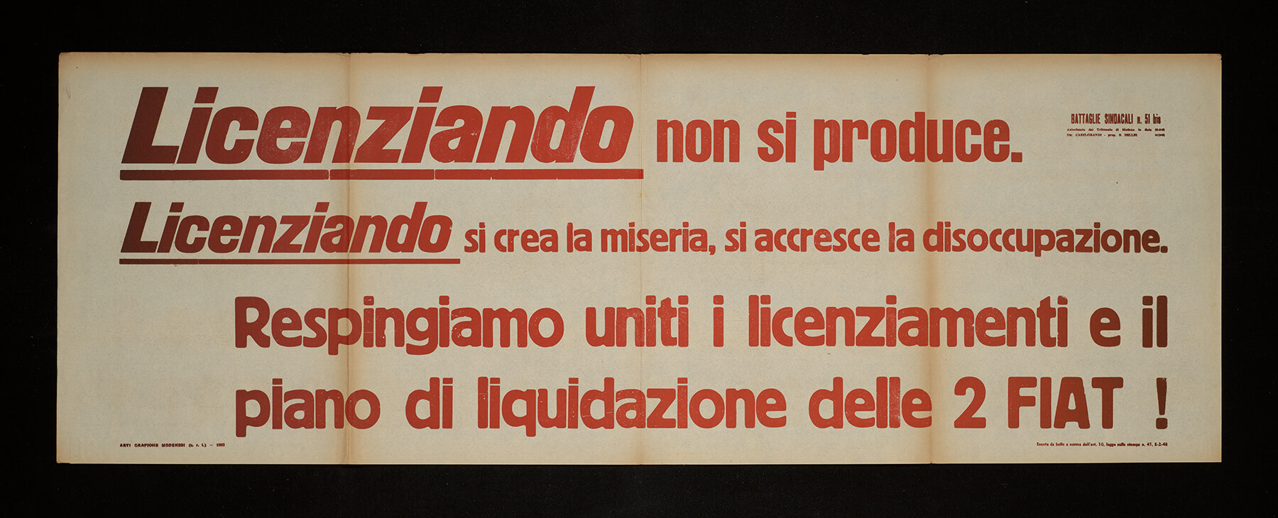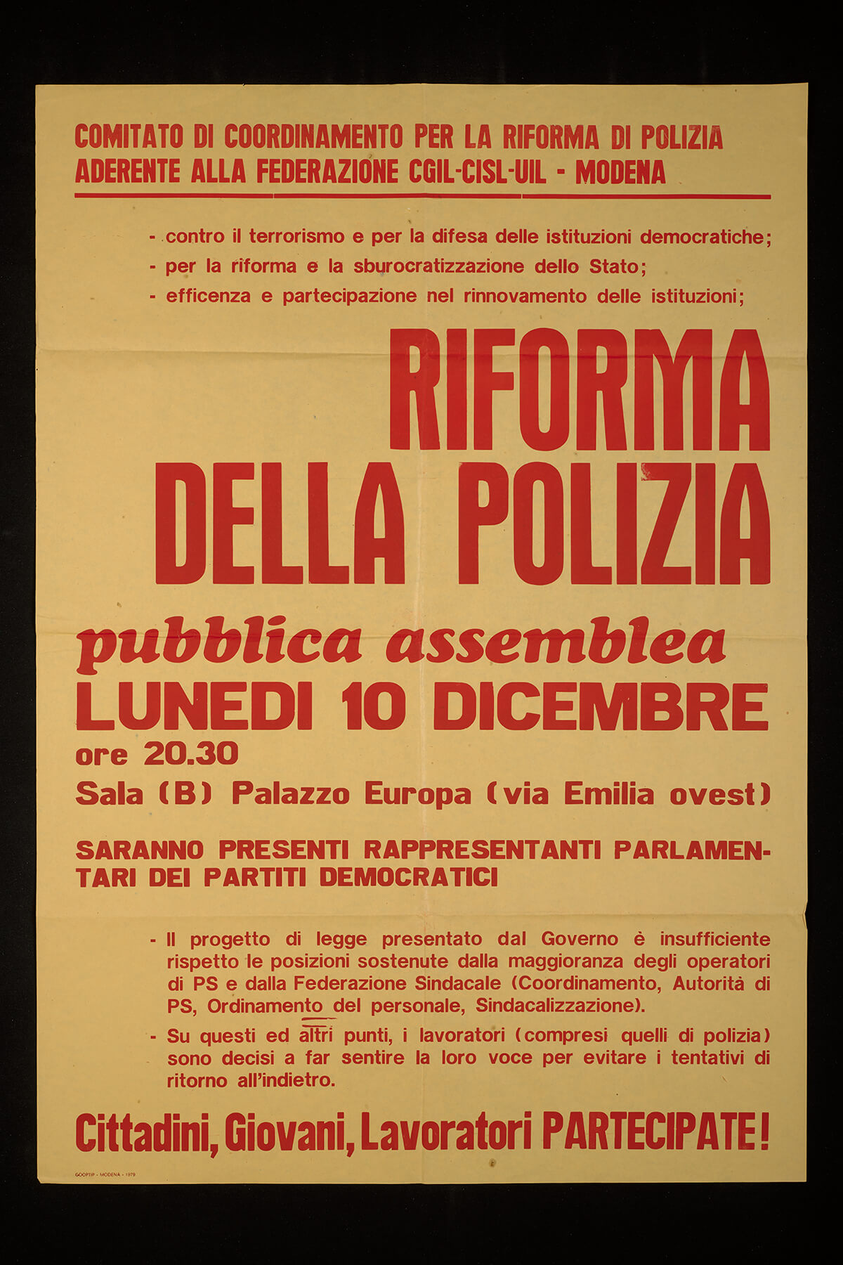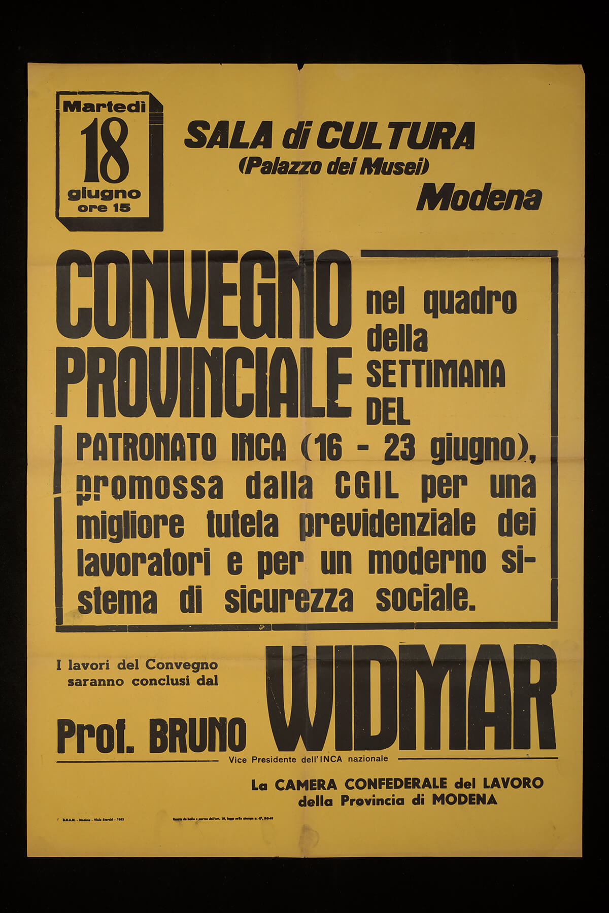 Il fondo dei manifesti è stato depositato in Istituto storico a Modena fra il 2019 e il 2021 nell’ambito della convenzione avviata nel 1993 tra CGIL di Modena e Istituto che affida all’Istituto storico di Modena la conservazione, valorizzazione e fruizione della documentazione. L’intero complesso archivistico prodotto dalla CGIL di Modena è stato dichiarato di notevole interesse storico dalla Soprintendenza archivistica per l’Emilia Romagna il 12 ottobre 1987. Ruolo importante nella formazione di questo patrimonio è stato svolto anche da Franco Beghelli, dirigente sindacale che, dalla fine degli anni Ottanta, ha gestito il Centro di documentazione della CGIL di Modena e che, a partire dal 1985, si è adoperato per il reperimento dei manifesti che si trovavano nei vari uffici della CdLT modenese e il recupero, presso le tipografie del territorio, di alcuni esemplari mancanti. L’intervento complessivo sulla raccolta dei manifesti, articolato in tre fasi di attività e distribuito sul triennio 2020-2022, è stato interamente finanziato dal progetto del Ministero della Cultura – Direzione Generale degli Archivi destinato agli archivi dei movimenti politici e degli organismi di rappresentanza dei lavoratori, e si è svolto di concerto e sotto la supervisione della Soprintendenza archivistica per l’Emilia-Romagna.