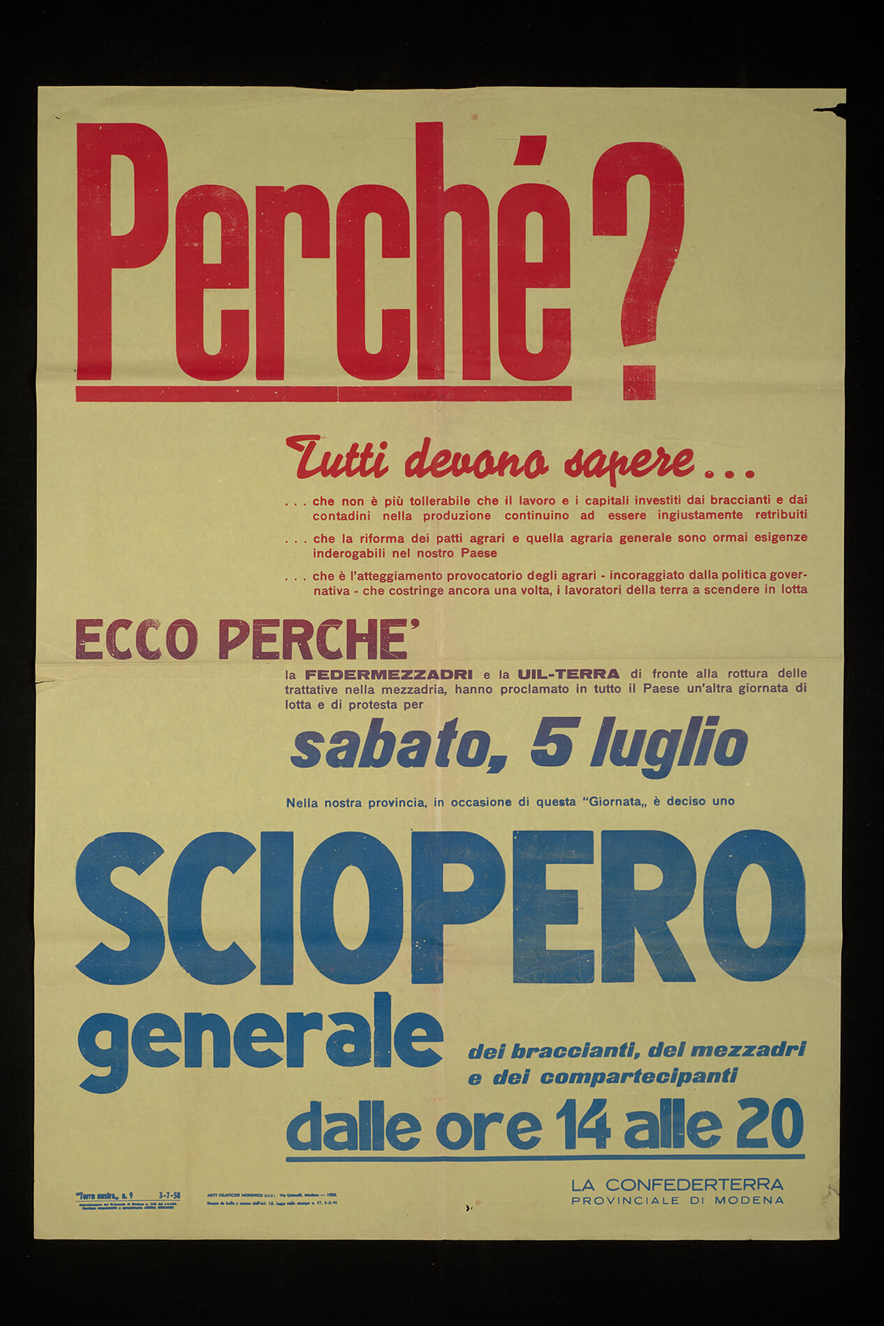 Il progetto aveva come obiettivo quello di far emergere dagli archivi alcuni spunti di riflessione relativi alla necessità di dare vita a una storia del lavoro e del movimento operaio modenese che racconti l’evoluzione sociale del territorio e del suo sistema produttivo. Trattandosi di archivi ancora in fase di lavorazione, in questa prima fase ci siamo limitati a individuare alcune serie significative con l’intento di continuare la ricerca negli anni successivi sottolineando che la storia fotografica che documenta l’attività di un sindacato, pur maggioritario nella provincia di Modena, non è immediatamente sovrapponibile con una storia del lavoro in senso stretto.