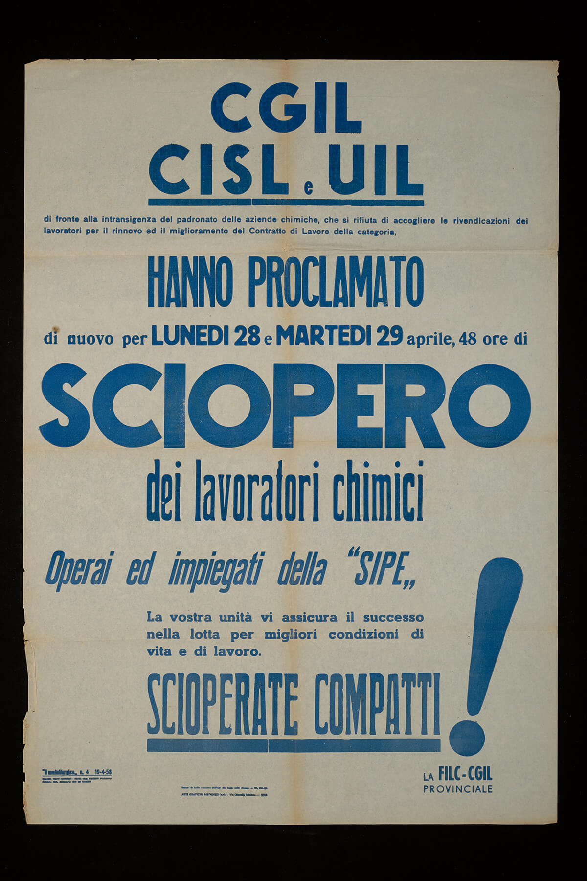 Tuttavia sono documentate alcune delle vertenze e degli scioperi più significativi tra gli anni che vanno dal dopoguerra fino alla fine degli anni Ottanta, le feste del Primo maggio con la loro simbologia, i momenti di dibattito pubblico come le conferenze di organizzazione e i convegni e le manifestazioni organizzate in memoria dell’eccidio del 9 gennaio 1950.